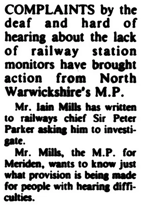 Sadly by the 1980s there was no doubt deaf people were being excluded from vital train information. Few stations, especially rural ones, had visual information of any sort. In 1982 MP Iain Mills wrote to Sir Peter Parker expressing a concern that deaf and hard of hearing constituents found it difficult to use most stations for there was no means of knowing whether trains were delayed or cancelled.