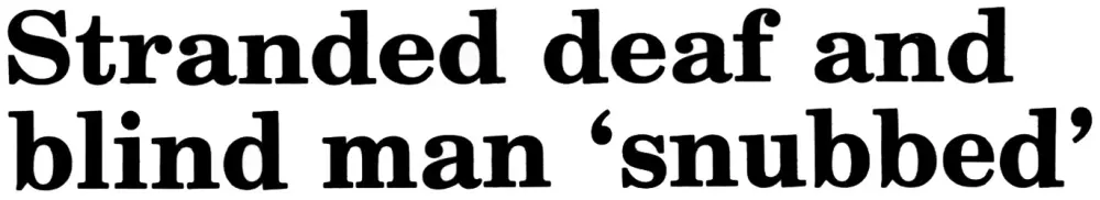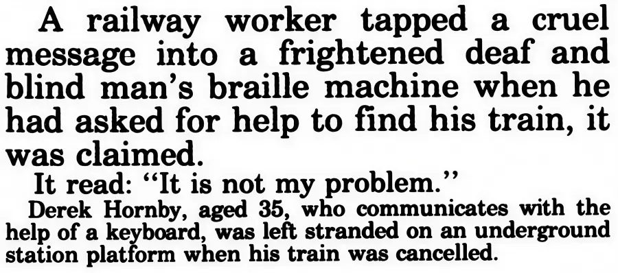 In 1993, Derek Hornby, a deafblind traveller, approached Merseyrail staff for assistance after finding his train home had been cancelled. His communication was by way of a braille machine used to request help. The station staff at Liverpool Central typed a response that evoked outrage. They typed ‘It is not my problem.’ Fortunately, Hornby was able to find some passengers who ensured he caught a different train home.