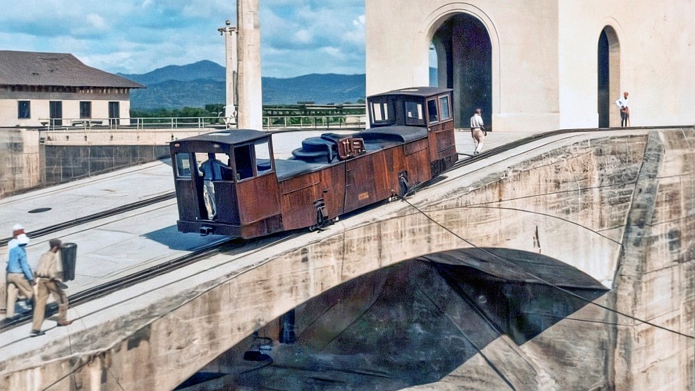 Looking at this image showing one of the canal’s rack operated electric locomotives (or ‘mules’ as they were called) even the scale of that doesn’t do justice to the huge tunnels that were built in order to sluice water from the upper to the lower levels of the lock chambers. There would generally be three of these tunnels – two on the outer sides of the locks and one under the centre island of the locks – deep below where this locomotive can be seen. Image adapted from one found on Ebay and colourised.