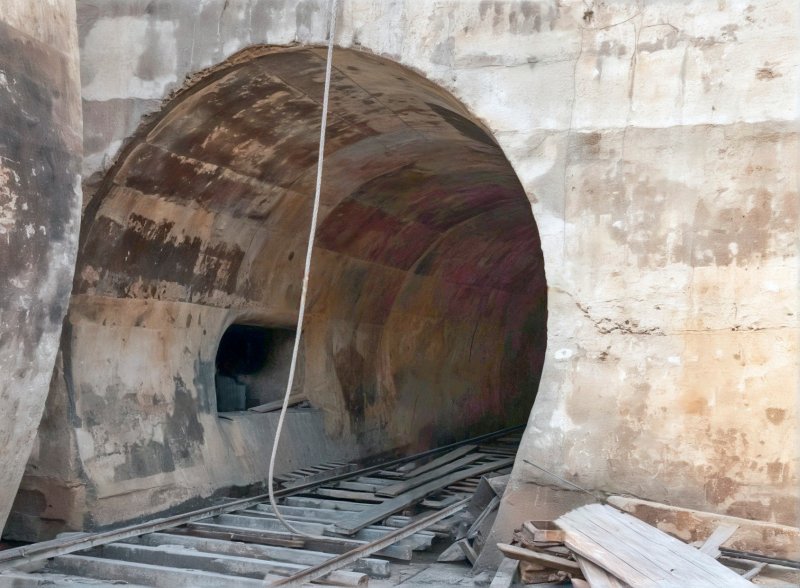 One of those culverts (or tunnels) seen close up. The diameter is eighteen foot. A railway has been laid through the tunnel to facilitate construction. Image adapted from one found on Ebay and colourised by the author.