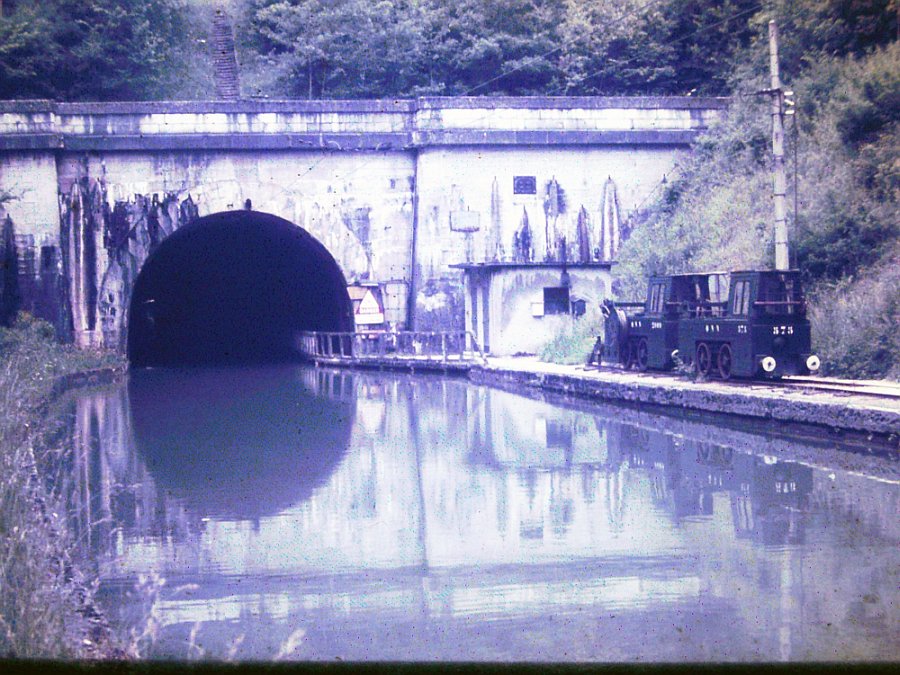 The Mauvages tunnel (3 miles or 4877m in length and built 1841-46) on the Marne-Rhine Canal in 1976. Barges were towed through the tunnel by a chain driven tug. They were however towed onward from the tunnel by way of these narrow gauge locomotives operated by the Compagnie Générale de Traction sur les voies Navigables (General waterway traction company)! Clearly the towpath in the tunnel was too narrow to furnish rail haulage thus this hybrid system existed. Facebook.