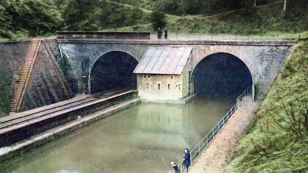 Modern view of the western portal of Arzviller tunnel with the SNCF main line tunnel at left. The canal tunnel’s very own railway can be seen upon the towing path. The tracks have been disused for decades. Wikipedia.