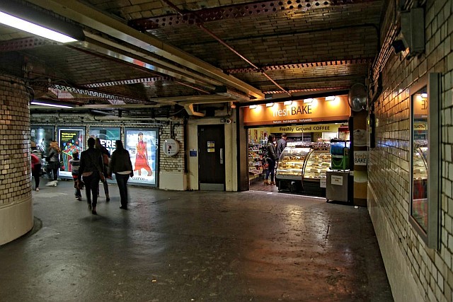 The original layout consisted of steps up to the ticket hall which was formerly in the arcade where the shops now are. The ticket booths were on the north side of this thoroughfare and the stairs on the south side. Both sides have since been built over with shops. The aforementioned footbridge was totally separate from the old ticket hall/stairway arrangement.