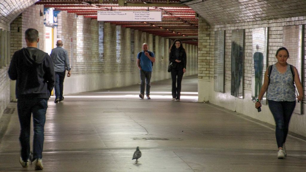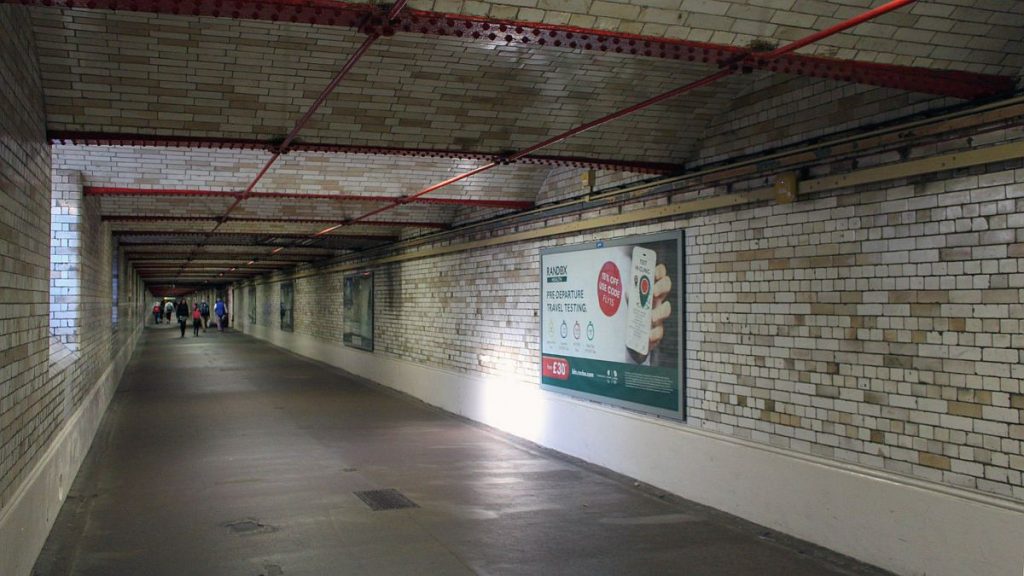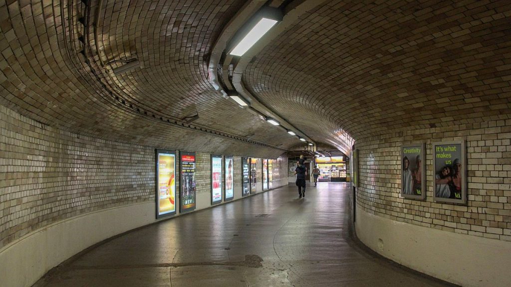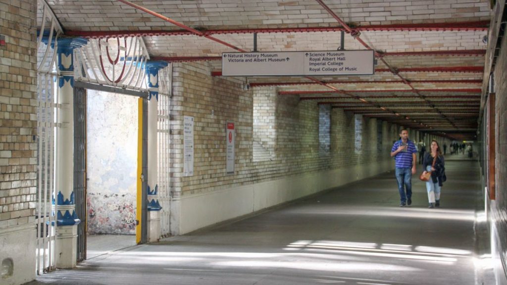 The subway just to the north of where it turns from Thurloe Street into Exhibition Road. The turn also marks the start of the subway’s gentle rise northwards.