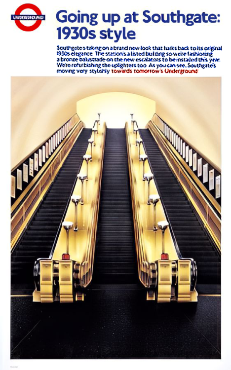 As the poster image below shows, the reason for this heritage feel to the station’s escalators is because its Grade II* listed. Evidently modern escalators with stainless steel sides and tops would have not worked here even though it has indeed been done at a couple of other listed tube stations.
