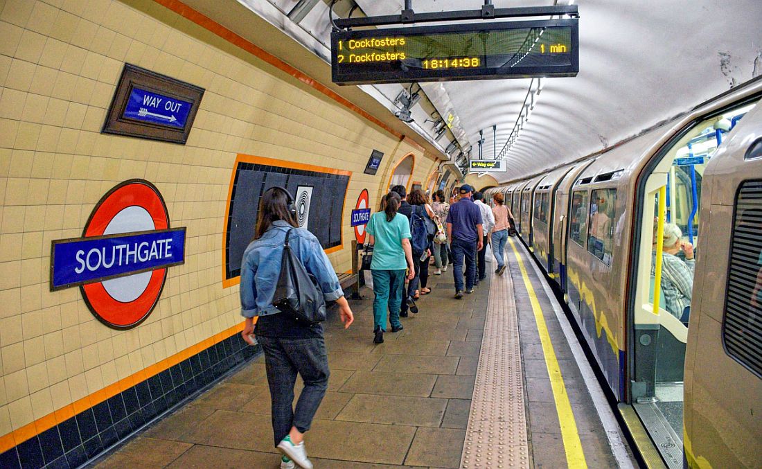 Southgate station with rush hour arrivals.