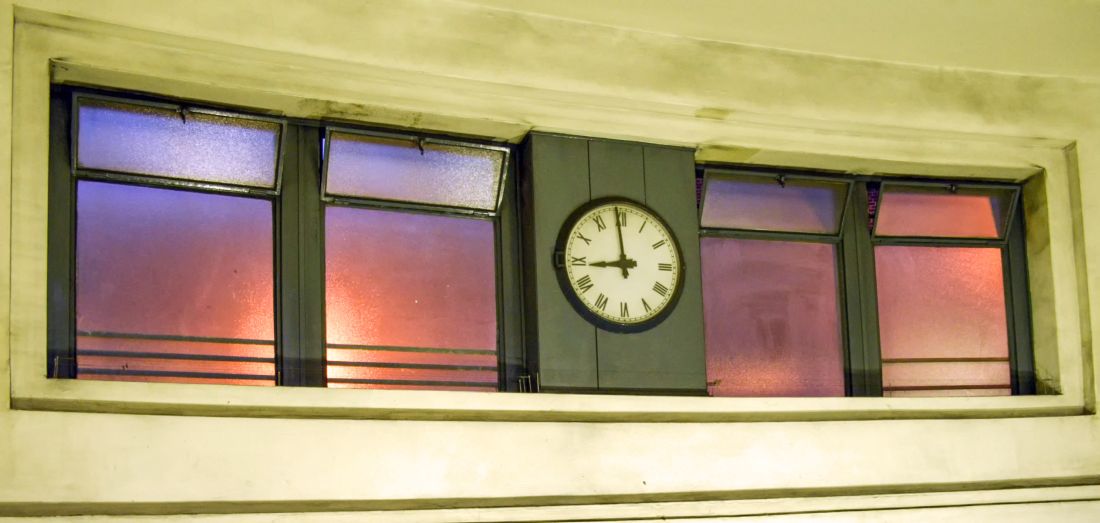 The windows with clock above the escalator bank.