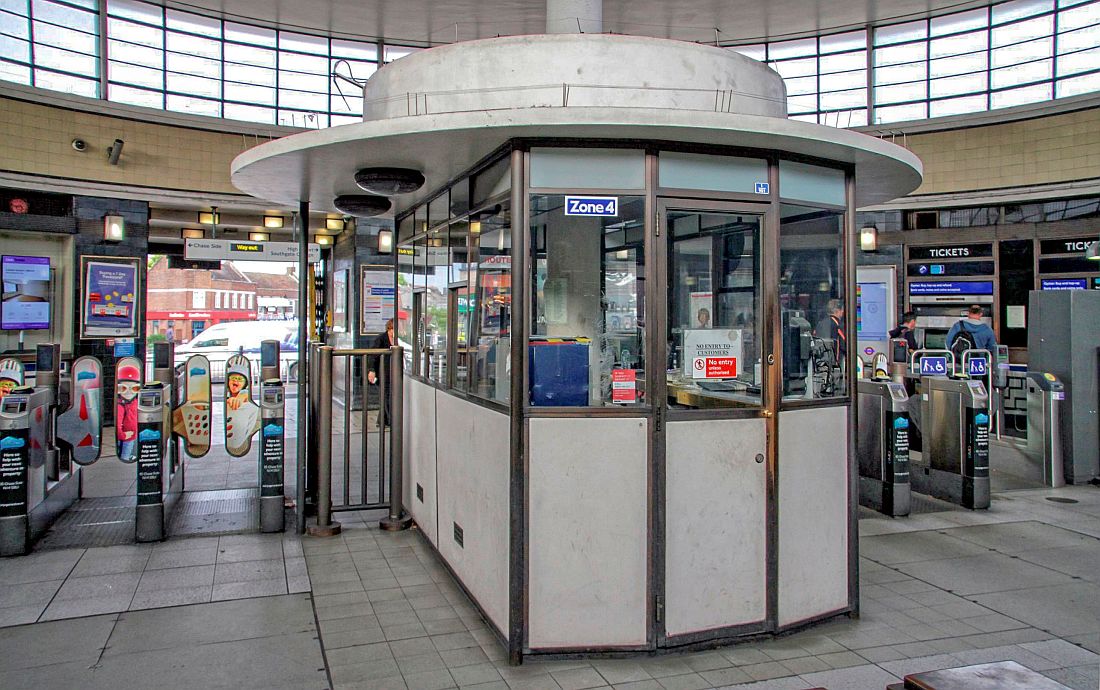 The passimeter (the ticket office) is unusual because it sports a circular roof – strangely a sort of hat if one likes. If one looks at that – there’s evidently a lot of ‘UFO’ about it! The light domes beneath the canopy look like landing feet or anti-gravity thrusters. Its as if the esoteric was truly a part of Southgate station. The passimeter canopy is essentially a miniature UFO hovering over the ticket hall! This detail no doubt complements the circular interior and the one solitary support that holds up the entire roof.