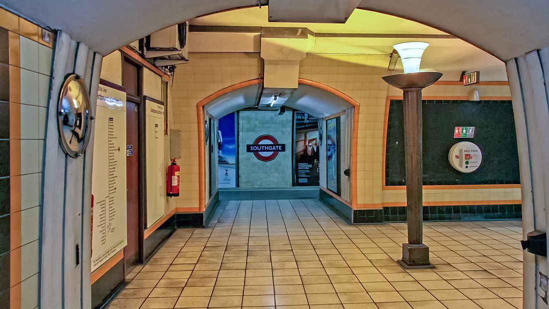 The lower hall at Southgate, in much the same style as every other station on the line – with certain exceptions made in order to economise on expense.