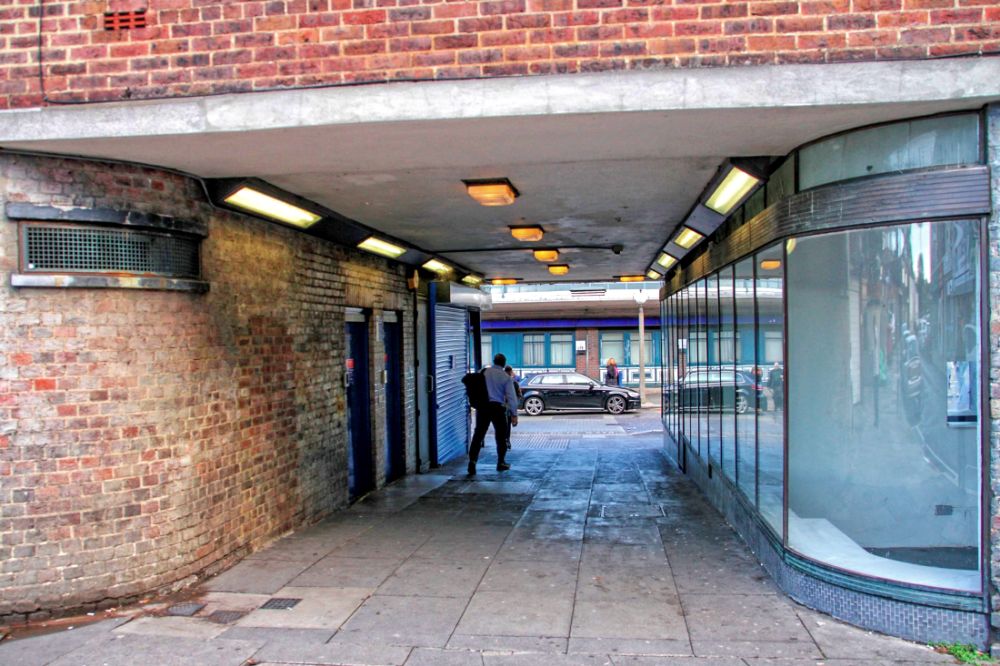 The passageway from Crown Lane leading directly to the station, note curved windows and styles of lighting including further examples of drop down shades.