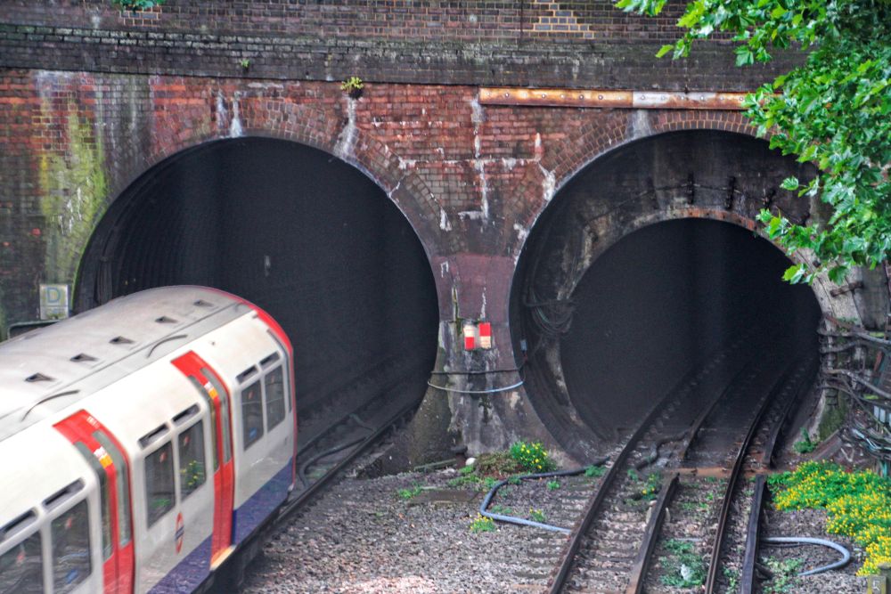 The tunnel mouths north of Southgate station. The full sized tunnel portals are evident.