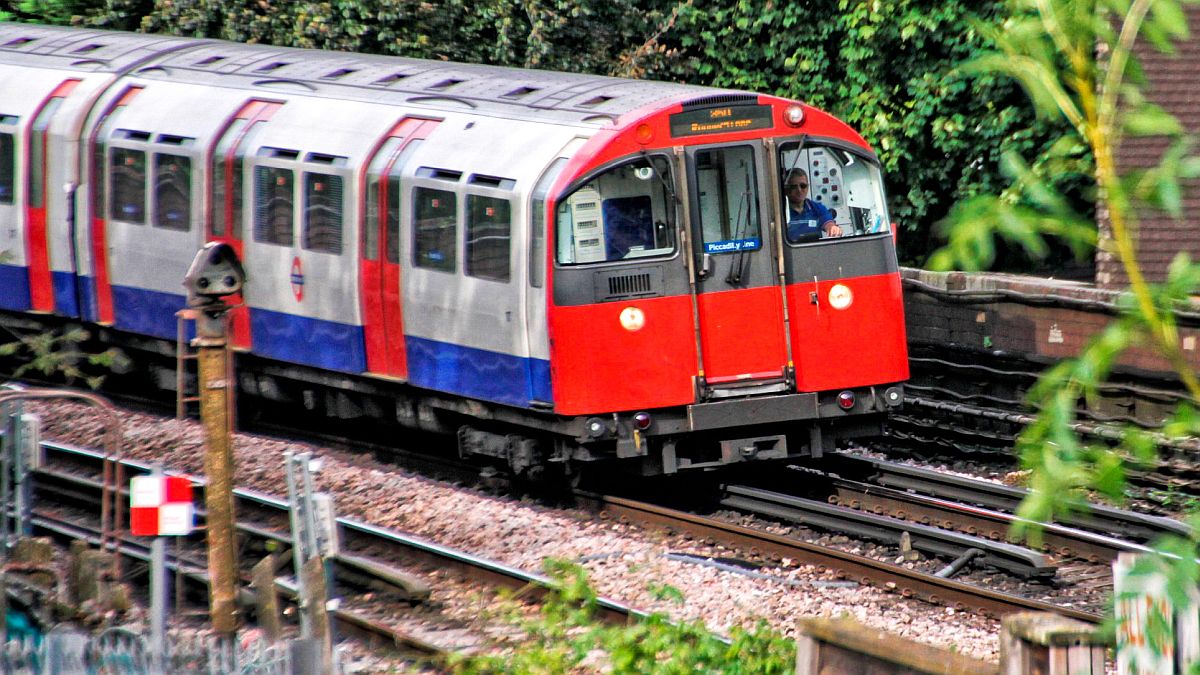 Heathrow bound 73 tube stock at Park Road, Southgate heading for the station.