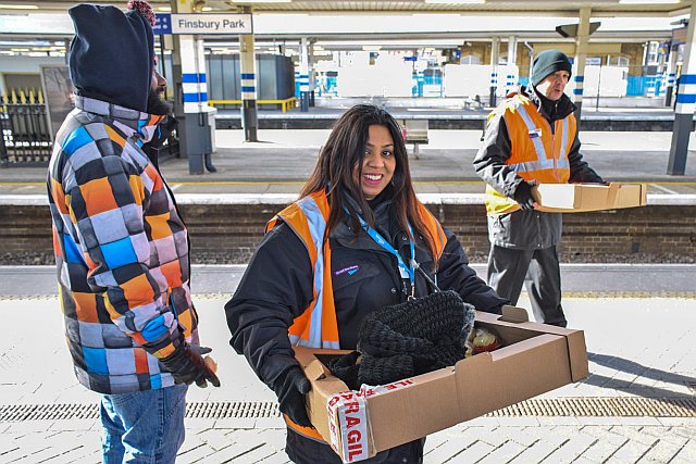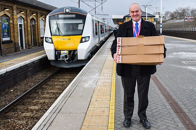 Staff at Finsbury Park handing out special Thameslink cakes to celebrate the new services.