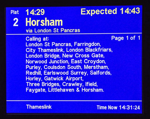 The full list of stops on the Finsbury Park – Horsham service. Faygate a surprise as just a handful of trains a day serve this remote station – in fact this service is the only Thameslink train to call here.