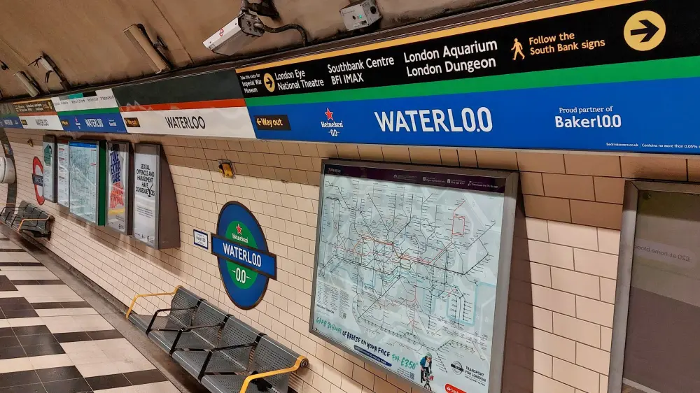 A considerable variation in the advertising could be seen in the form of ‘Proud Partner of Bakerl0.0’ – this invariably showed up where the stations featured Heineken roundels (Paddington, Baker Street, Piccadilly Circus and Waterloo). That label was shown in three different formats – the most common being blue text and border on a white background – as seen at Paddington, Baker Street and Waterloo. At Piccadilly Circus a green background and blue font was used instead, whilst at Waterloo there was an extra version with white font/blue background. Thus Waterloo station was the only example to feature two different types. Not only that, the while/blue label was placed to the side of the roundel instead of below like the others. This was done because the seating here is sited immediately below the roundels. At Waterloo several other variations could also be seen in the advertising compared to that at the other stations.