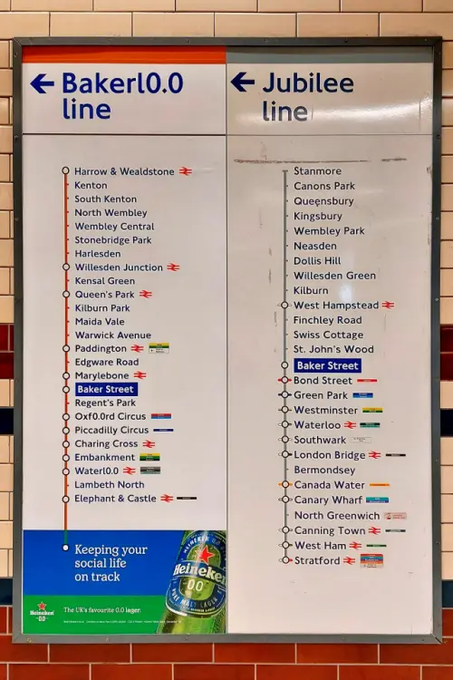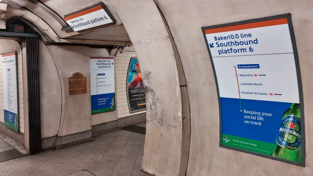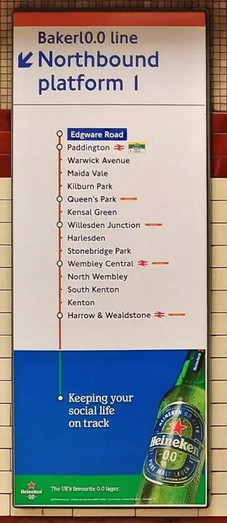 This week the Bakerloo line gained new advertising! Its for Heineken’s 0.0 lager with pretty negligible alcohol (at the most 0.05%). Hence the Bakerloo was restyled as the Bakerl0.0 line! The 0.0 looks better in Johnston and that explains why the advert has a great effectiveness when one views it in that particular font.