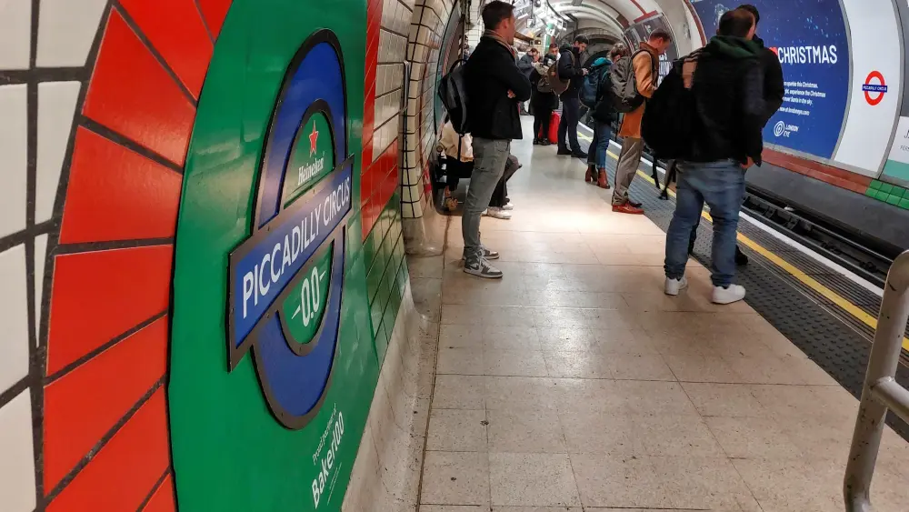 Piccadilly Circus with its Heineken roundels. The last time the station had a comprehensive make-over it was styled Picardilly Circus!