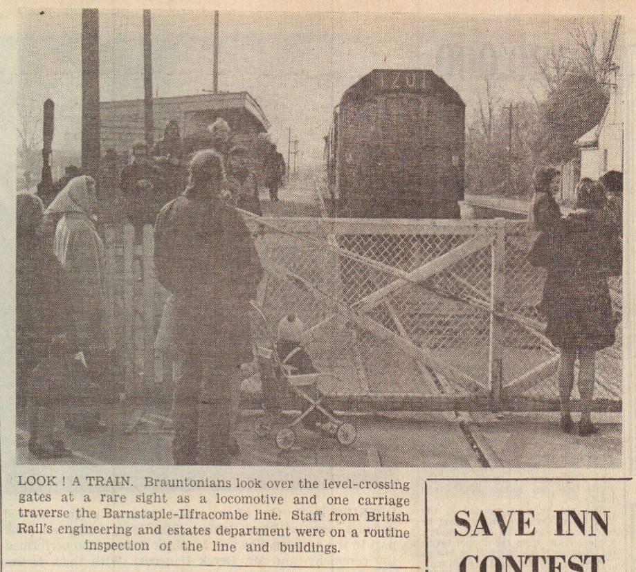The final train – an inspectors’ trip to Ilfracombe to assess the line’s condition on its return at Braunton crossing in February 1975. It was said this trip was made with a view to possible restoration of passenger services. No such luck! BR began demolishing Ilfracombe station in the summer of 1975. The tracks were ripped up in October 1975. The North Devon Railway Preservation Society tried to stop the track being ripped up and BR told the society if it paid £20,000 by 9am the next day the demolition work would stop. The society was unable to comply with such a request at extremely short notice. Source: Cyberheritage
