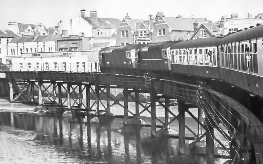30 August 1970 – as the book this picture comes from tells us, this was in fact the final locomotive hauled excursion along the line. D6588 and D6566 head across the Taw towards Barnstaple Town with what is thought to be the Class 33s’ one and only visit to Ilfracombe. The locomotives are depicted arriving at Ilfracombe in a picture further up this page. For a description of that railtour here’s a PDF document.
