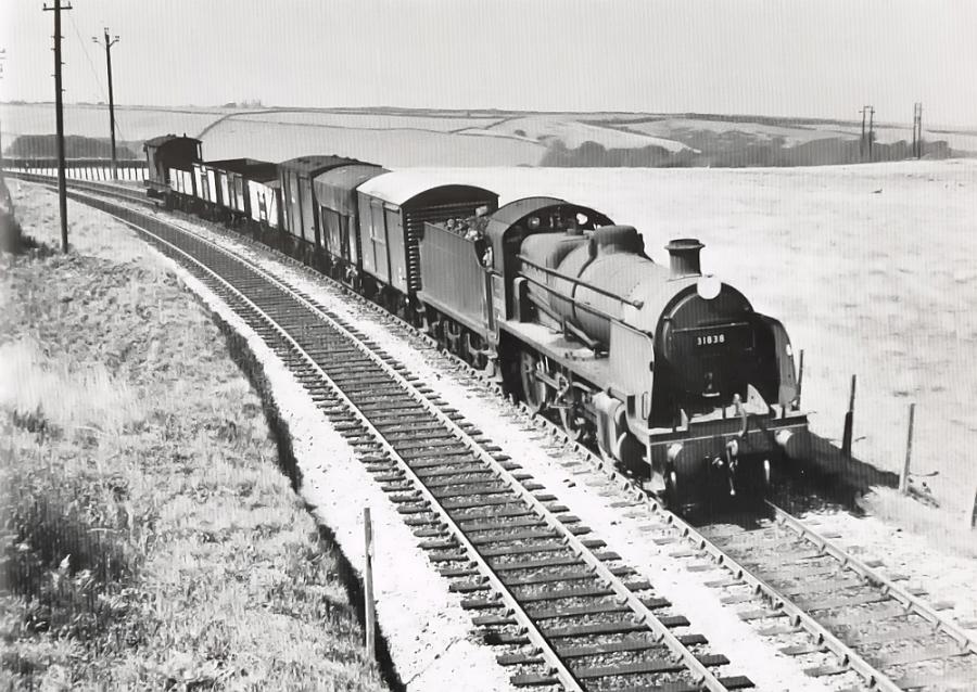Mogul 31838 in charge of a goods train near Mortehoe station. September 1959.
