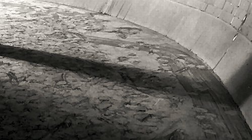 The patterned surface on the floor of the subway is actually dust from the trains & tunnels. Footfalls have created the seemingly random patterns.