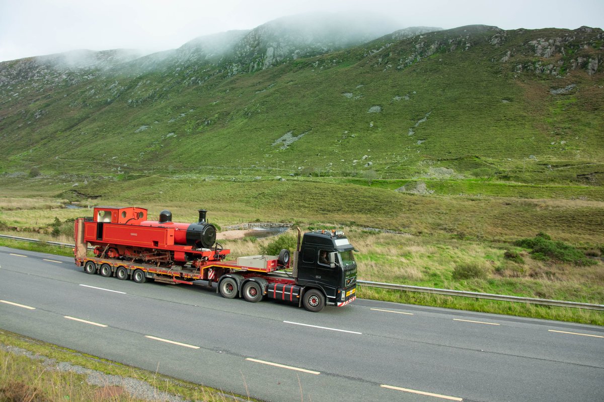 In October 2021 Drumboe was taken by low loader from the Railways Preservation Society of Ireland’s workshops to Donegal Town where the locomotive forms the centrepiece of a new exhibition on the CDRJC. Drumboe is seen here in the Barnesmore Gap with the former railway alignment visible on the hillside in the background. Source: Twitter.