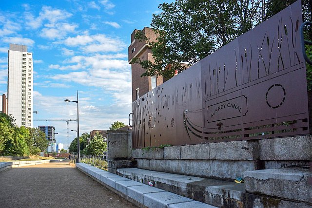 The linear park comes complete with words and phrases commemorating the former waterway. Its nice to walk along here however like other bits of London’s lost waterways, especially the Croydon, they’ve used words and terms that don’t actually belong hereabouts but are more akin to the canals north of London and the Midlands. I don’t think anyone on the Surrey canal itself would have known what Gongoolzer meant along with other terms that too have been used, so these are not historically accurate.