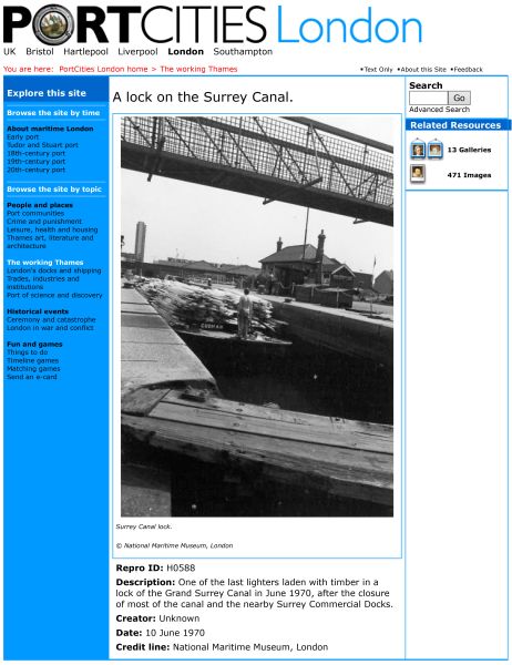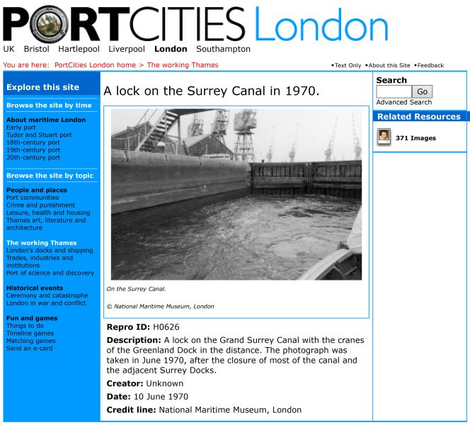 Photographs of the lock, the canal’s last commercial traffic and Plough Way bridge are even harder to come by however here’s some including two from the Portcities website which ceased in 2009. These pictures no longer exist not even on the Internet Archive. I think the Grand Surrey feature was included on that site about 2004 and it consisted of a number of pictures showing the entrance lock and lighters, though there is one picture showing the canal further towards Old Kent Road depicting disused wharves.