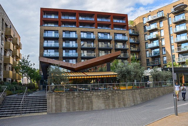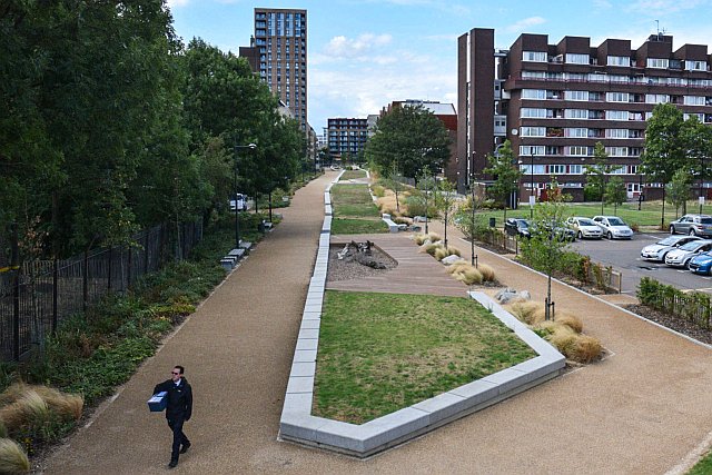 Looking in the opposite direction, the canal’s alignment has now been employed by these new residential units and the Plough Way cafe. By the way the name of this linear park is the Surrey Canal linear park – whilst Google cites it as the Grand Canal Avenue! It was about at this point the canal was in readiness for the stretch underneath the old Plough Way bridge, thus the cafe has the right name in terms of the area’s history.