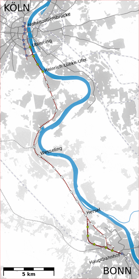 Route of the Rheinuferbahn (Rhine Bank Railway.) The stops marked ‘U’ indicates the newer route in both Köln and Bonn used by tram 16. Sourced from Wikipedia.