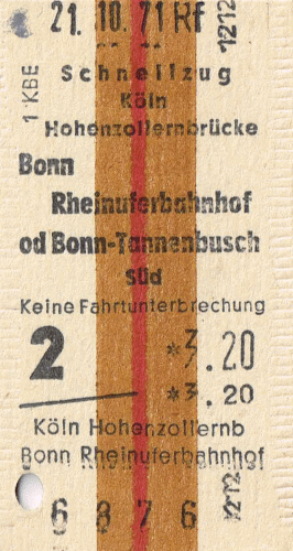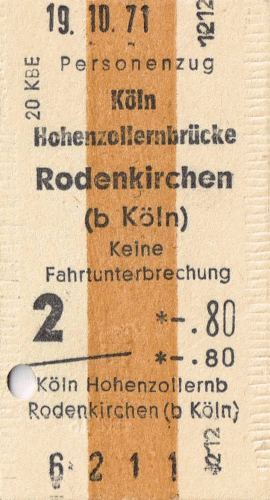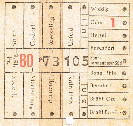 Generic ticket issued by the train guard when we wanted to go from Marienburg (where we stayed) to the city centre. Both Marienburg and Rodenkirchen are listed! This paper ticket was also issued for stops along the Vorgebirgsbahn.