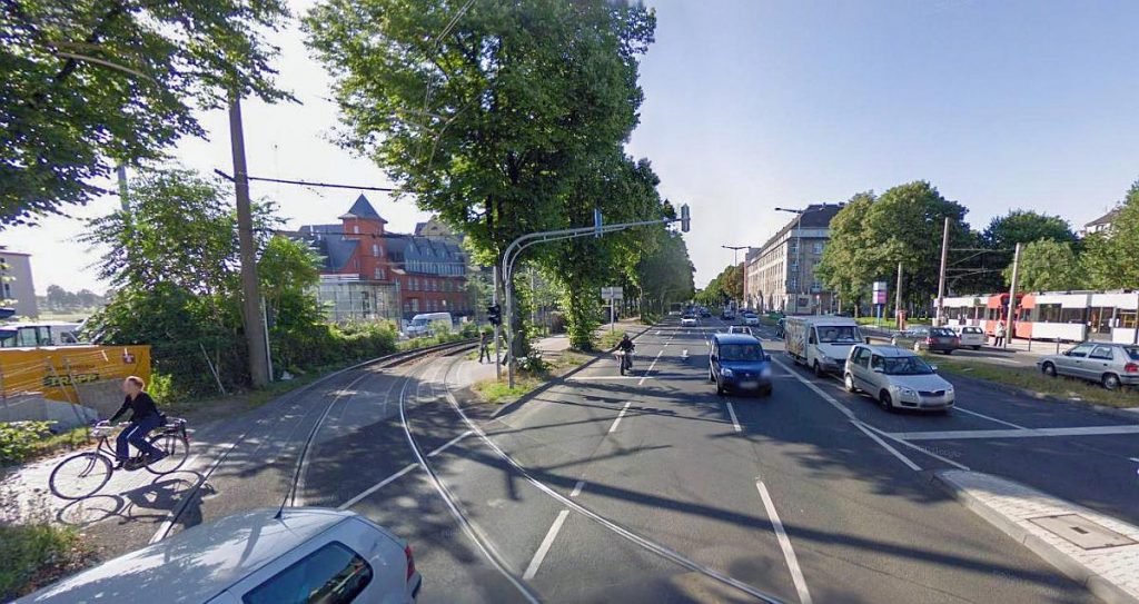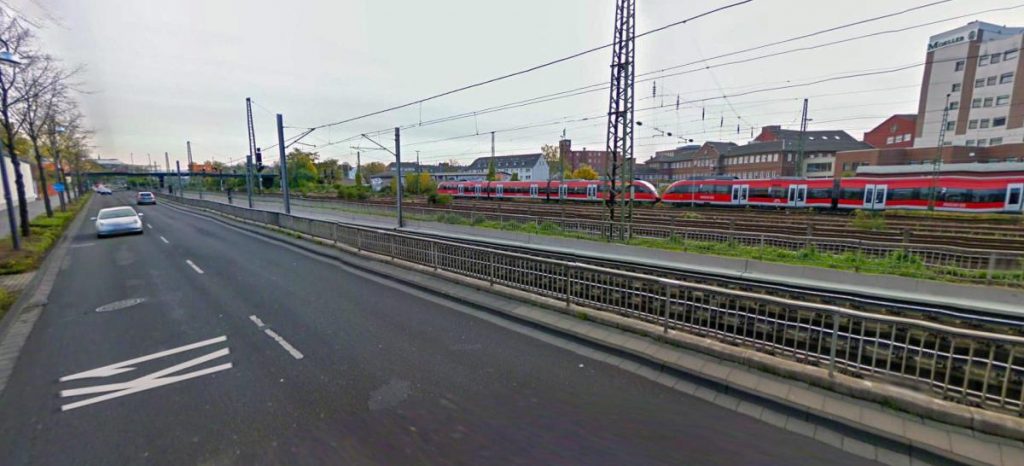 This is Ubierring where the present tramway leaves the old Rheinuferbahn alignment and heads through Köln via the city’s streets. North of here the KBE (which continued where the cyclist is) no longer exists. Source: Google Streets.