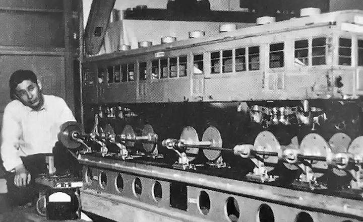 Tadashi Matsudaira with a test model EMU car which was used to test the stability of bogies at high speeds.