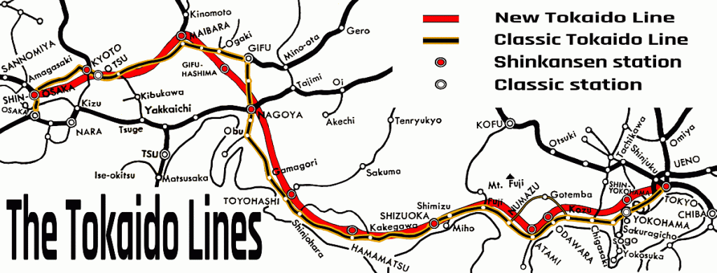 Map I adapted to show how the New Tōkaidō Line would follow the classic route. The 12 original Shinkansen stops are shown. The section from Kozu to Numazu via Gotemba was the original Tōkaidō route before its diversion along the Pacific via Odawara and Atami.