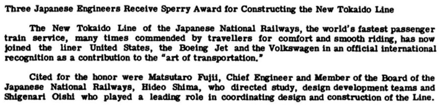 Construction began in 1941 but was eventually stopped because of the war. In the fifties when the project was resurrected, Oishi took it upon himself to walk, for a second time, the entire 500 plus km between Tokyo and Osaka in order to determine where the now projected and more advanced Shinkansen should be built. He was one of three JNR engineers to receive in 1966 an Elmer Sperry award for the construction of the New Tōkaidō Line. Hideo Shima (more on him later) and Matsutaro Fujii (JNR’s chief engineer) were the other two.