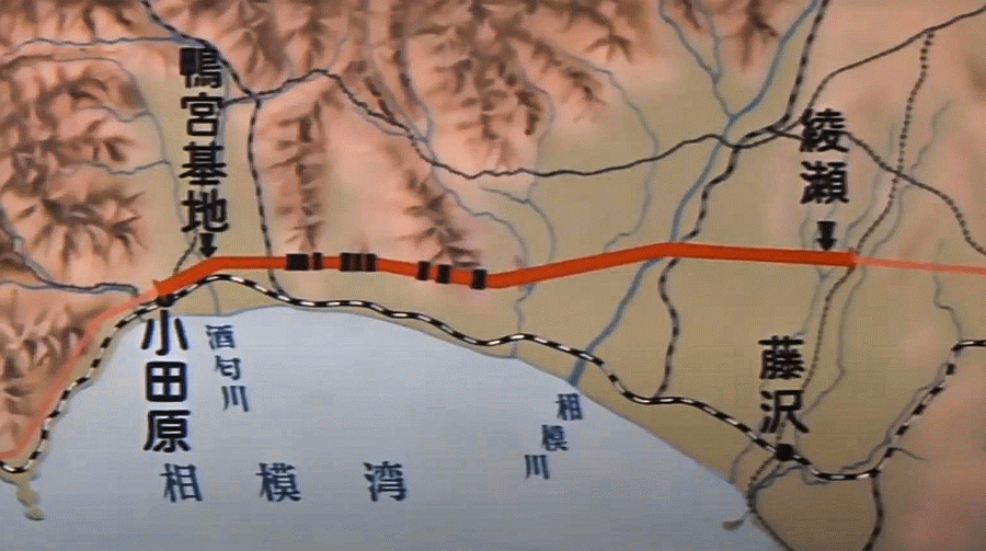The extent of the Kamomiya test track which extended from a point west of Yokohama to west of Odawara. Some of the Shinkansen’s earliest infrastructure can still be seen along this section.