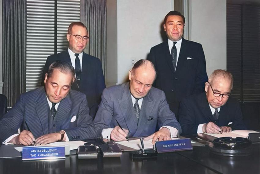 Signing the paperwork to seal a $80 million loan to JNR for the Shinkansen. Shinji Sogō at right. I had this image coloured specially. Source: World Bank Japan
