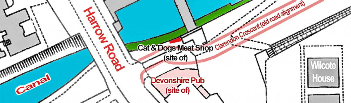 By the time the redevelopment hereabouts had been implemented and the Westway (A40M) built, many of these locations alongside the Grand Union Canal or the Great Western Railway some distance to the south had been consigned to the past, including the Cat and Dogs’ meat shop. Today the actual site is a small grassy patch overlooking the Grand Union Canal.