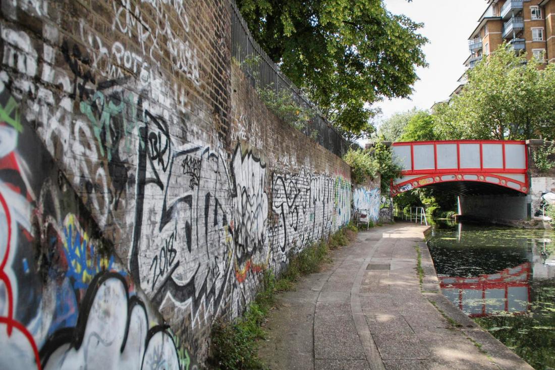 View looking long the canal towpath towards Westbourne Green bridge. The rear of the Cat and Dogs Meat shop would have been about where the wall bends to follow the towpath. Its not the same wall these days however!