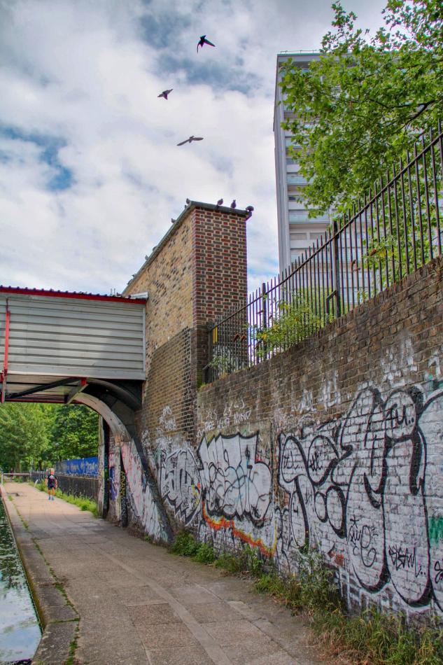 The Cat and Dogs Meat shop would have been immediately on the right (and probably overhanging the towpath a couple of feet or so.) Wilcote house can be seen, its one of the sixties built tower blocks built to replace the Victorian houses that were once numerous in this part of London.