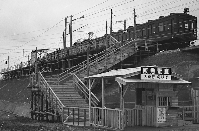 In this view on Google Maps the Hankyu line is seen climbing up towards the level of the Tōkaidō Shinkansen. The above 1963 picture was taken a little further eastwards, evidenced by the electricity pylons. I think the temporary Kammaki station can just be made out in the distance.