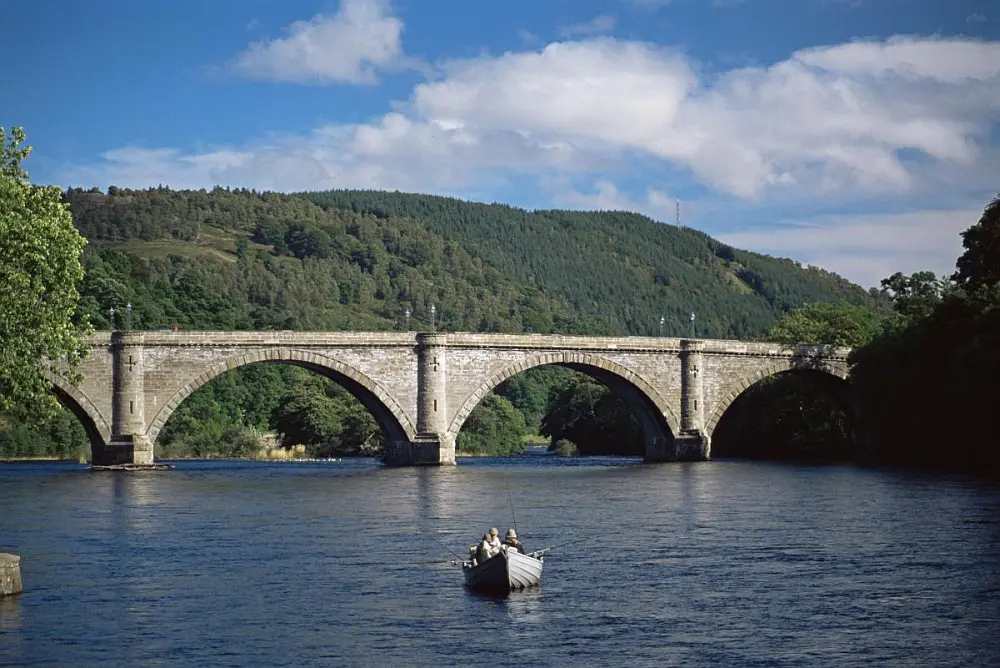View of Dunkeld bridge with fishermen on the River Tay. The view shows the bridge’s elegance very well. Source: Birnam Arts.