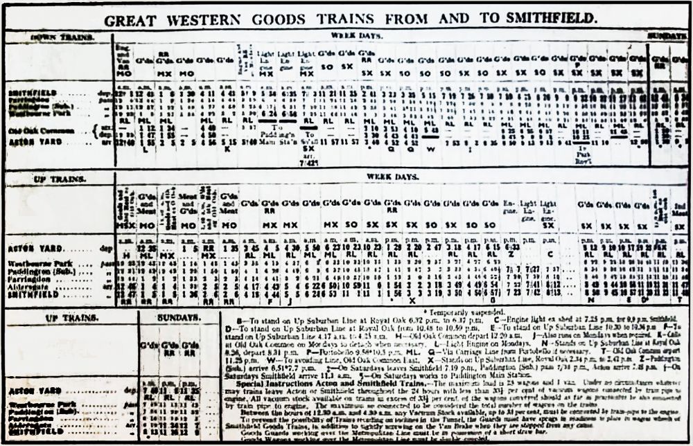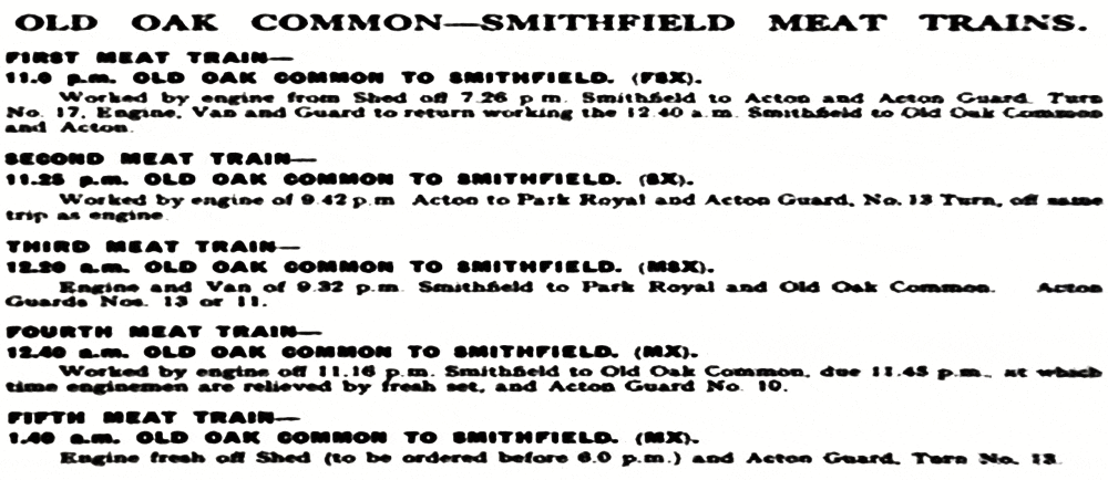 Listing showing 1939 freights from Old Oak for Smithfield. Interestingly this shows just a year later the Smithfield traffic had been reduced to the hours between 11 am-2pm. Image upscaled and enhanced from a document I found on Ebay.