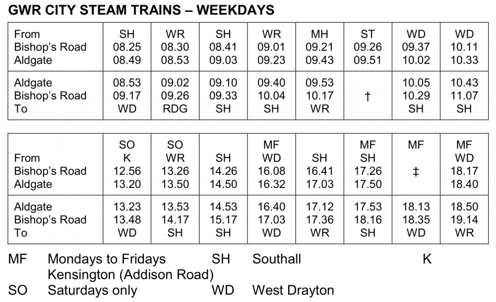 1906 example of the GWR timetable featuring through trains to Aldgate. Source: LURS.